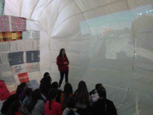 Quelques jours avant la semaine des arts et des sciences, les élèves de 1º, 2º et 4º ESO ont participé à la construction de trois sculptures géantes en assemblant des sacs en plastique. Deux personnages de grande taille et une sorte de petite salle ont ainsi vu le jour. Grâce à des ventilateurs, ces structures se gonflaient d’air et prenaient forme. Ainsi, le public a pu pénétrer dans la salle afin de visionner une projection en relation avec des sculptures gonflables utilisées dans deux expositions d’art à Paris. La vidéo abordait aussi le thème de la publicité gonflable dans le monde d’aujourd’hui. En parallèle, les élèves-visiteurs ont fabriqué eux-mêmes de petites sculptures en plastique qu’ils ont pu animer en les gonflant d’air avec un sèche-cheveux.